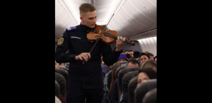 Un tânăr jandarm le-a oferit pasagerilor Tarom un moment special, interpretând imnul României la o altitudine de peste 10.000 de metri. Cu vioara sa, a transformat cabina avionului într-o scenă plină de emoție și patriotism, în mijlocul celor prezenți. Personalul de bord a anunțat că urmează un eveniment inedit pentru călători.
