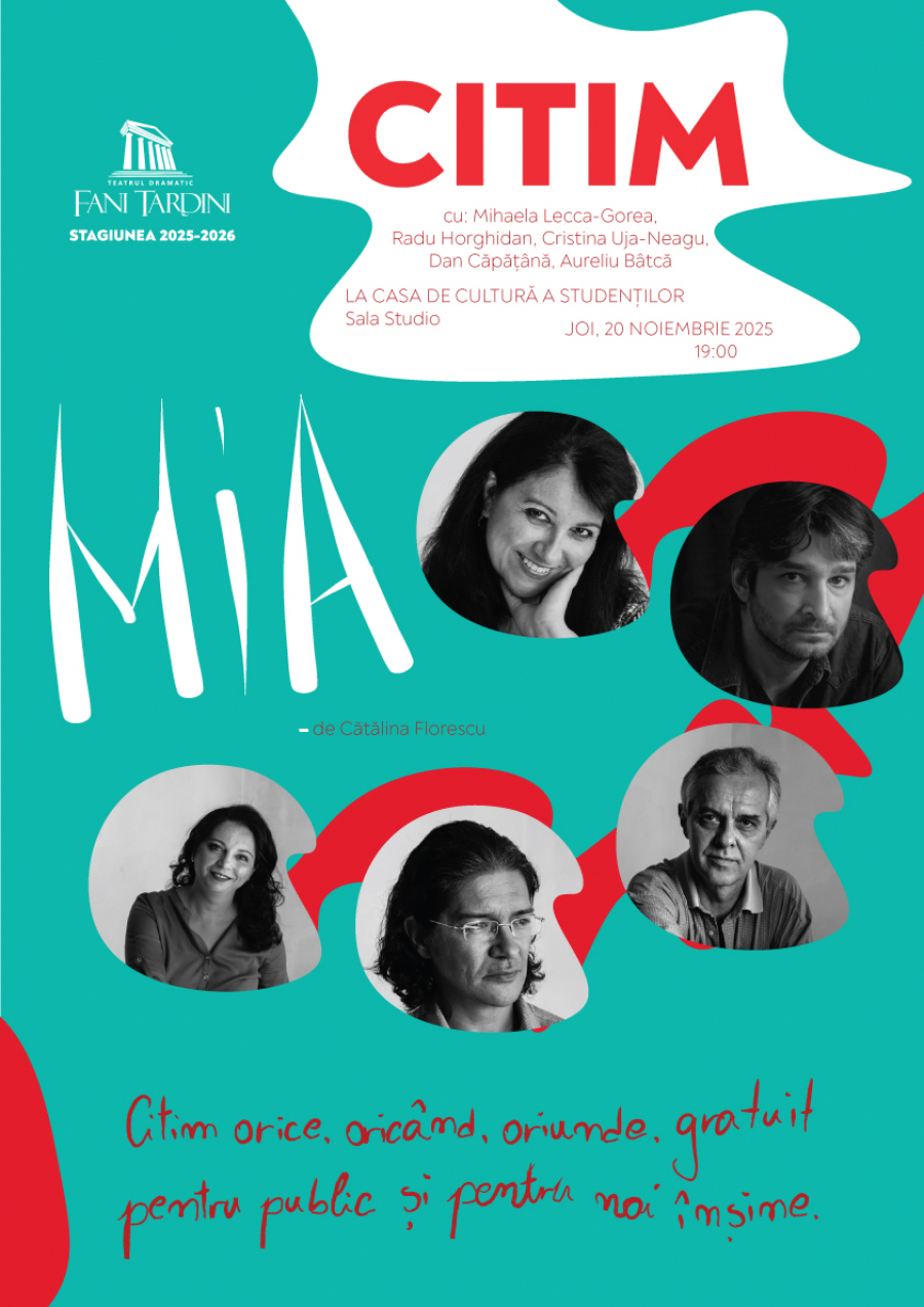 Pe 20 noiembrie, de la ora 19:00, actorii Teatrului „Fani Tardini” vor susține lectura spectacolului „Mia” de Cătălina Florescu, la Sala Studio a Casei de Cultură a Studenților din Galați. Pe scenă vor urca Mihaela Lecca-Gorea, Radu Horghidan, Cristina Uja-Neagu și Aureliu Bâtcă.
