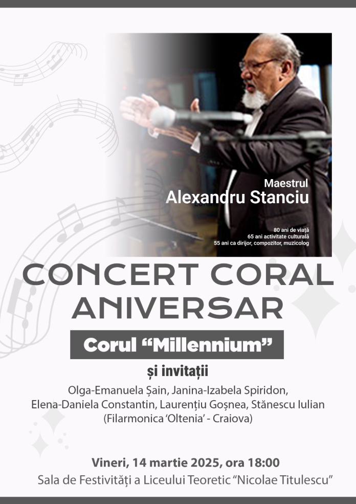 Corul "Millennium" va organiza un Concert Coral Aniversar, dedicat unei cariere impresionante în domeniul muzicii. Acest eveniment va avea loc pe 14 martie 2025, vineri, începând cu ora 18:00.